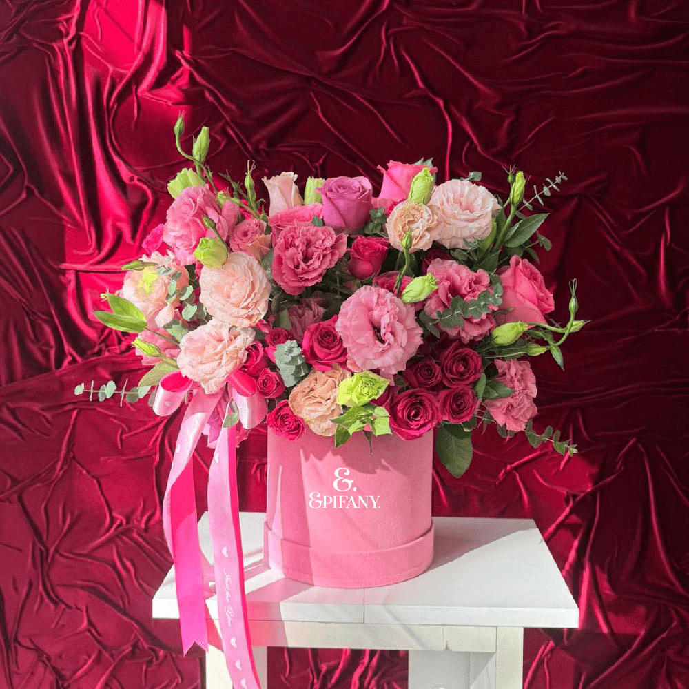 Box con 8 rosas, minirosas, lisianthus y eucalipto chino. Box de terciopelo rosado hasta agotar estock.