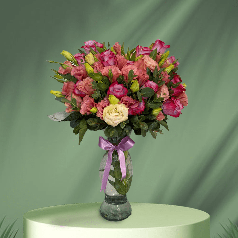 en la parte superior a base de espuma floral, con 12 a 18 rosas lilas, lisianthus