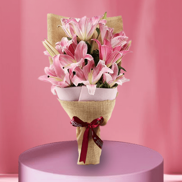 Ramo con muchos lirios (aprox 3-4 varas de lirios) Aromáticos entre flores abiertas y botones 12 a 18 flores. Envuelto en tela yute y liston.